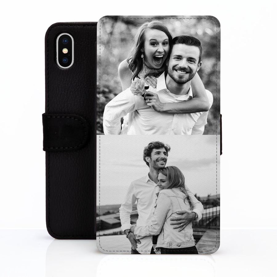 This personalised iPhone Leather Wallet Case features 2 photos on the front cover, adding a personal touch to your phone case. The wallet includes inner card slots, providing convenience and functionality. It can also be used as a phone stand for hands-free use. Showcase Your Memories in style and functionality.